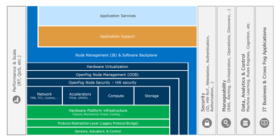 A detailed architecture stack shows the interrelationships between various hardware, software infrastructure, and application software layers, as well as various cross-cutting concernssuchas security, performance, manageability, analytics and controlthat impact the function of all layers. As security is one of the most complex and critical aspects of IoT systems, a special appendix dives deeply into OpenFog security guidelines. The OpenFog architecture is depicted in figure 1 above.