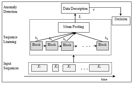 LSTM outputs for each packet sequence are averaged by using mean pooling method. By this way, we can get a new sequence with many new temporal features. After that, new sequences will be input to Data description unit to find a decision function y to determine whether a sequence of packets is anomalous or not based on observed data. The function that takes the value +1 marking a normal sequence and -1 otherwise: