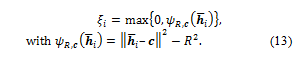 Where χ is smooth parameter – it is handled to expect that Q_χ (.) converges to P(.). According (17), Q_χ (.) converges to P(.) when χ increases. Thus, in our experimentation, we need to choose a large value for χ. When Q_χ (ψ_(R,c) (h ̅_i ) ) converges to P(ψ_(R,c) (h ̅_i ) ), as a consequence, an approximation F_χ (c,R,θ) of SVDD objective function F(c,R,θ) converges to F(c,R,θ).Now, the optimization problem is defined as