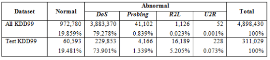 KDD99 dataset[24]is widely used as one of the few publicly available datasets for IDS problems. It is believed to apply as an effective benchmark data set to help researchers compare different intrusion detection methods. Although it is still not an accurate real-world dataset, there are many papers that describe their implementations on this dataset specifically. This paper will use the KDD99 dataset, however, our work would work with any dataset that conforms to these rules. There are many recent datasets containing more modern attacks, such as the UNSW-NB15 dataset generated for the Australian Centre for Cyber Security [25], Intrusion Detection Evaluation Dataset (CICIDS2017) contains benign and the most up-to-date common attacks [26], Unified Host and Network Dataset[27] collected from the Los Alamos National Laboratory enterprise network over the course of approximately 90 days. Most of these datasets may be more applicable and newer for recent use cases, however, they are not used as publicly as KDD99. The KDD99 dataset consists of approximately 4,900,000 single connection records. The distribution of data samples is presented in Table 1. This dataset must deal with the imbalanced data problem. All data is pre-processed to match to the detection methods proposed.