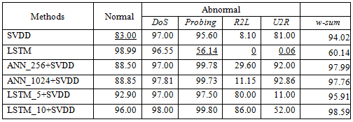 We consider the low performance of U2R and R2L attack types. Both attacks are rare in the dataset and an individual data instance can be considered as anomalous with respect to the rest of the data which are the normal accesses. User to Root (U2R) attacks is illegal to access to the administrator account, exploiting one or several vulnerabilities. Remote to local (R2L) attacks are local access to get the privilege to send packets on the network, the attacker uses trial and error to guess the password. Both U2R and R2L attacks are condition specific and sophisticated. Initiation of these attacks is not similar as compared to others, therefore, these attacks are considered as point anomaly. Consequently, the root problem is coming from LSTM model itself which is highly effective in detecting attacks that are spread over packets in a period while attacks considered as point anomaly are not good. To deal with this challenge, in the near work we will explore the SVDD model. The performance of SVDD can be improved when a few attacks are available. When examples (objects which should be rejected) are available, they can be incorporated in the training to improve the description. In contrast with the training normal examples which should be within the sphere, the attack examples should be outside it. Overall, it can be concluded that the proposed method is quite good considering its performances across both attack and Normal classes, especially attacks have a high frequency such as DoS and Probe. A convenient in our combination models is that we only train normal data to obtain a flexible data description model and it will be used to know how the outlier sensitivity can be controlled in a flexible way. This makes sense in a real dataset where normal examples are available, while the abnormal data are rare or difficult to obtain.