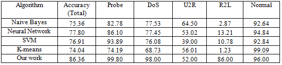 We also compare our works to benchmarks of Nicholas J. Miller [34]. Authors used NSL-KDD dataset – is a subset of the KDD99 dataset, so they have the same data characteristic (attack types). Through Table 4, it is seen that our work is better other work in the benchmarks.