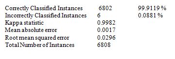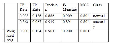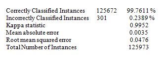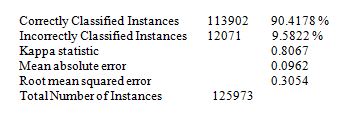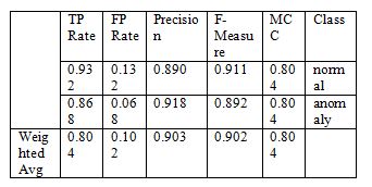 As per the results obtained from the experimentation of algorithm J48 (Formally C4.5) for the intrusion detection, the algorithm works very well and has shown increase in the detection rate and True positive rate and decrease in False positive rate. The Kappa statistics and F-Measure of the algorithm is very good. The True positive rate of the algorithm is 99.8%, which means that the algorithm detects 99.8% of the attacks truly. On the other hand, the false positive rate is as low as 0.2%. Thus in overall the algorithm works very well for the purpose of Intrusion detection system. On the other side the results obtained from the experimentation of algorithm Naïve Bayes for the intrusion detection, the algorithm works very well and has not shown increase in the detection rate and True positive rate and not so much improvement in decrease in false positive rate. The Kappa statistics and F-Measure of the algorithm is not so good. The True positive rate of the algorithm is 90.2%, which means that the algorithm detects 90.2% of the attacks trulybut is not as good as J48 which yields the detection rate of 99.8. On the other hand the false positive rate is not so low which is 10.2%. Thus in overall the algorithm does not work well for the purpose of Intrusion detection system because of missing attributes, if the instances and default value is taken into consideration.