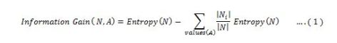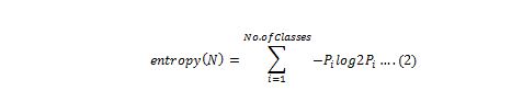 Where N is set of instances at that particular node and |N| is its cardinality, Niis the subset of N for which attribute A has value i, and entropy of the set N is calculated as:
