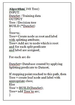 C4.5 is a successor of ID3 developed by Ross Quinlan and is implemented in WEKA as J48 using Java. All of them adopt a greedy and a top-down approach to decision tree making. It is used for classification in which new data is labelled according to already existing observations (training data set). Decision tree induction begins with a dataset (training set) which is partitioned at every node resulting in smaller partitions, thus following a recursive divide and conquer strategy. In addition to a data set, which is a collections of objects, a set of attributes is also passed. Objects can be an event, an activity and the attributes are the information related to that object. To every tuple in the data set is associated a class label which identifies whether an object belongs to a particular class or not. Splitting can further be performed only if the tuples fall in different classes.