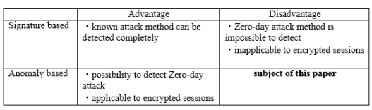 Since network service became public common infrastructure, the problem of attack detection continues [1]. The techniques of attack grow complex and frequency of attack keeps on increasing. An outcome of detection against sub-specific attack methods by signature-based intrusion detection (IDS) becomes clear, however, it is always late to the offensive of brand new attack methods (Zero-day attacks) [12]. It is necessary to block communication off at the time when a doubtful sign was found. Therefore, development of anomaly-based IDS is expected. However, almost of all of them take statistical detection method,Zero-day attack was detected after it was already spread. Although the methods using machine learning schemes are focused, there are no effective schemes.This is because the number of input parameters is limited as compared with signature-based IDS.Therefore essentially, proactive counter measures are not achieved.