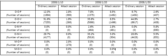 Table 2 shows an example rate of theclassified session (2008/1/10, 2008/1/20 and 2008/1/30).Thenumber and type of attack vary greatly from day to day, but following this classification method, the rate as of 2008 and the trend of current (2016) do not change much. Therefore, the efficiency of detection table improves on leaps and bounds by applying this classification method to proposal method.