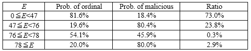 As the result, we can get the value of entropy for a target session. Then we judge it whether ordinal or malicious by using its entropy. The detection using only entropy distribution, the experience of the staff is necessary and there is no objectivity. Therefore, we use judgement method based on probability. Let PO(E) be the probability of ordinal session when the value of entropy is equal to E. And let PM(E) be the probability of malicious session.