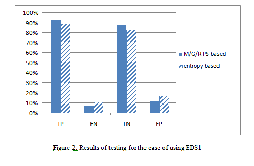 Figure 2 shows that TP and TN rate of M/G/R PS-based detection mechanism are higher than in entropy-based detection mechanism, TP rate of 92% and TN rate of 88%. The rates of entropy-based detection mechanism are just at 89% and 83%, respectively. In terms of error indication, both rates of FP and FN from the proposed mechanism are smaller than the rates of entropy-based detection mechanism.