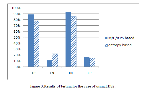 In the second testing case, EDS2 includes chains of 10 seconds of attack interleaved by 10 seconds of non attack. It extends periods of attack longer than in case of EDS1. Results of the testing case are described in figure 3. Figure 3 shows that the rates of correct indication from the proposed mechanism are still higher than the rates from entropy-based detection mechanism, TP rate of 89% and TN rate of 93% comparing with 78% and 85%, respectively. In terms of error indication, FN rate of the proposed mechanism is still smaller than the FN rate of entropy-based detection mechanism, 11% comparing with 22%. However, value of FP rate from the proposed mechanism is greater than the rate from entropy-based detection mechanism, value of 17% comparing with 15%, but two values are not much different.