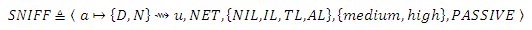 Sniffing is a method by which an attacker can compromise the security of a network in a passive fashion [42]. To initiate this attack, an attacker captures and analyses all network packets to retrieve some useful information. For this, an attacker utilises a tool called Sniffer which can capture packets in a network and analyse them to identify sensitive information, such as authentication information consisting of usernames and passwords. We denote this attack using SNIFF and model it in the following way: