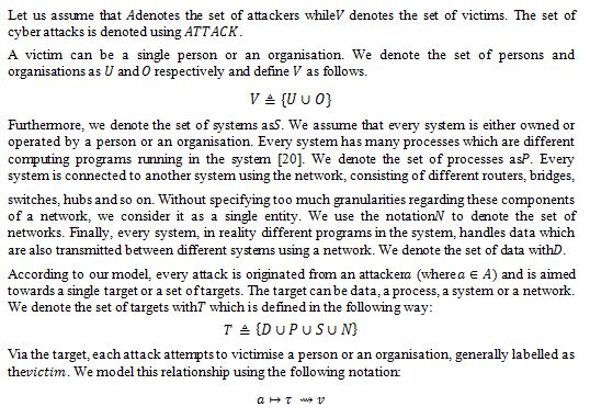 The paper is structured as follows. The related work is presented in Section 2. In Section 3, we present the model of a cyberattack. Next, a taxonomy of different cyberattacks is presented in Section 4. Then, we model different cyberattacks utilising our model in Section 5, Section 6 and Section 7. We discuss the usefulness of our model by presenting two examples in Section 8 and finally, we conclude in Section 9 with a direction of future work as well.