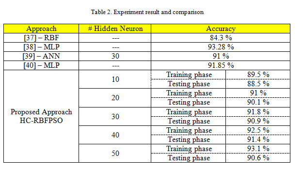 The particle size is an important factor in HC-RBFPSO when the algorithm uses small particle numbers it produce poor performance. But, large particle number produces a very residual improvement compared to the improvement that occurs when using Median particle size but increases the computational cost of the algorithms. From the results obtained you can see that HC-RBFPSO approach has a good performance in the classification accuracy. As shown the Table 2, the proposed approach used little number of neurons, therefore, asmall amount of the computational cost.Now, we present the results for training and testing of HC-RBFPSO approach. The experiments are a number of conducted by using adifferent number of neurons in RBFNNhidden layer as shown in table 2. We recorded the results when using 10, 20, 30, 40, and 50 neurons for each class.
