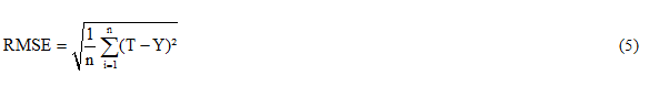 Where i = 1,2,…,M ; d = 1,2,…,n, t+1 is the current iteration number, t is the previous iteration number, ω is the inertia weight, c1 and c2are the acceleration constant which is usually between [0,2], Pi = (Pi1, Pi2,…, Pin) is the best previous position of particleiknew as the personal best position (pbest), Pg = (Pg1, Pg2,…, Pgn) is the position of the best particle among all the particles in the swarm known as the global best position (gbest), and r1and r2 are random numbers distributed uniformly in (0, 1). The fitness function that is used in step 2 of PSO is Root Mean Square Error (RMSE) for this paper; RMSE is shown in equation 5.