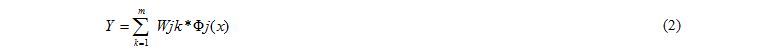 Where x = (x<sub>1</sub>, x<sub>2</sub>, x<sub>3</sub> . . . , x<sub>n</sub>) is the input data, c<sub>j</sub> is the center of j-th hidden neuron, and σ<sub>j<sub> is the width of j-th hidden neuron. The output of RBFNN for each category is calculated as in the following equation 2: