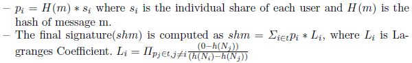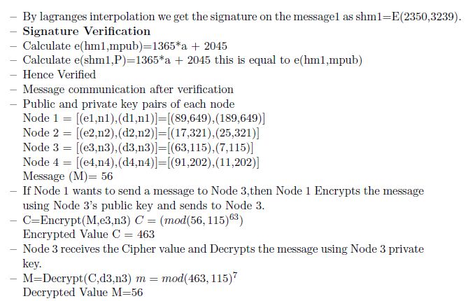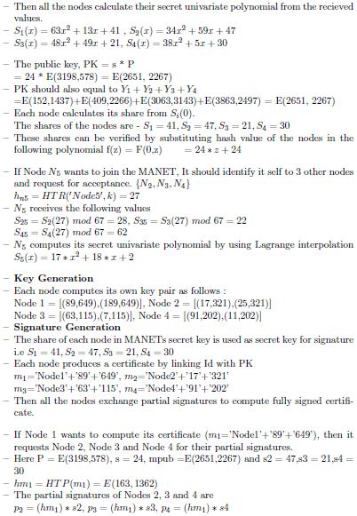 Now every node ni has two secret keys namely partial secret key of MANET si and individual secret key ski, partial secret key is used to partially sign a certificate and any t out of n nodes are required to sign a certificate to generate fully signed/valid certificate. When a node ni wants to get a public key certificate, it asks its neighboring nodes to generate partial signature on the certicate linking ni||pki. If the node ni receives at-least (t-1) partial signs, then the node itself can generate a partial sign using it’s own partial share, now the node has t partially signed values, then it uses the following Lagrange’s interpolation to generate a fully signed certificate.