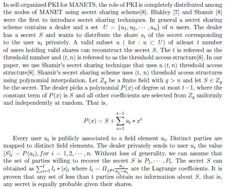 Public key cryptography(PKC)[12] provides many security services like con den-tiality, integrity, authentication, non-repudiation, encryption and digital signatures. Public key infrastructure(PKI)[5] manages digital certi cates which are important in the deployment of public key cryptography. In PKI environment, Certi cate authority(CA) issues and maintains the certi cates of participating entities, the certi cate contains the public key and the ID of the entity, the CA signs the certi – cate using the master secret key s and this certi cate can be veri ed by the master public key P K. In MANETS we cannot adopt the same PKI, as the network is dynamic and infrastructure-less. So the role of the CA needs to be distributed to the nodes i.e., the master secret key s is to be shared among di erent nodes and the master secret key can only be generated if atleast the threshold number of shares of secret are pooled together.