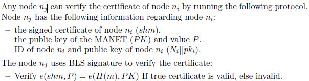 Now that every node obtains its certificate in the above described manner. Next we discuss the protocol to verify the certificate.