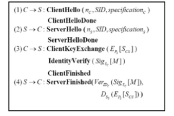 According to the figure, in the first step, the user C sends the ClientHello to the server S. This message includes a new random number (nc), session ID (SID), and cryptography specifications (specifications c). The specification c uses improved TTLS. IBS and IBE have been used as providers of communication security. MD5 is a typical hash function. AES is a symmetrical encryption algorithm. ClientHelloDone signals the end of the first step. In the second step, the server S responds with ServerHello, which includes the new random number (ns), a session ID (SID), and secret Specification s. Specification s is a cryptography set supported by the server S. ServerHelloDone signals the end of the Second step. In the third step, the user C adopts a pre-master Scs first and encrypts it with the public key (Ps) of server S, as well as IBE algorithm. The secret text is sent to the server S with ClientKeyExchange. Then, the user C creates a signature Sig SC ([ M]) and sends it as an IdentityVerify message to the server S. Finally, ClientFinished signals the end of the third step. In the fourth step, the server S uses IDc to obtain the public key (Pc) of the user C and then employs Pc in the IBS to verify Sig SC ([ M]). The authenticity of the user C is verified only if the owner of IDc is valid. This process completes the verification of C through S. Then, the server S decrypts Ss with its private key Eps [Scs]. Since SSC is new, accurate decryption indicated that the S is valid owner of IDs. This step verifies the authenticity of the S. ServerFinished signals the end of the Fourth step. Finally, a secret public key is calculated between S and C by KCS = PRF (SCS, nC , nS).