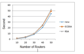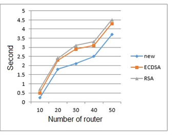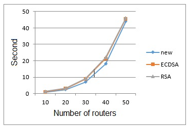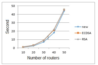 First, a fixed number of connected users was considered, while the number of routers between AP and the main server increased in each stage. Runtime of the proposed cryptography was compared to RSA and ECDSA under EAP-TTLS architecture in similar conditions. Results are presented in following Figure.