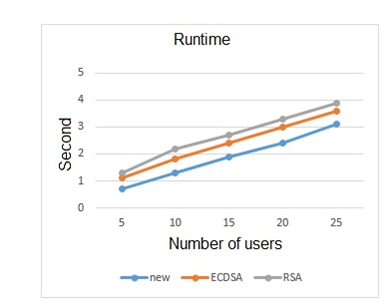 Figure 3 Comparison of runtime between the proposed algorithm with ECDSA and RSA with increasing the number of users