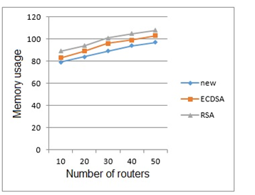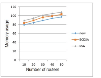 Figure 4 Comparison of memory usage between the proposed algorithm with ECDSA and RSA with increasing the number of routers
