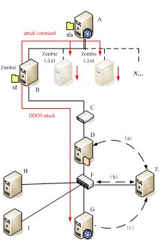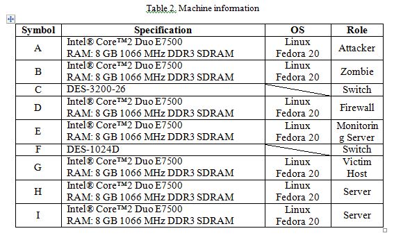 The overall procedure of our system architecture is illustrated in Figure 4. The machine information of symbol A-I are listed in Table 2. The scheme can be divided into three parts: Attacker, Monitoring Server and Victim Host. There are two main modules within the Attacker: a command module (tfn) and a Zombie module (td). The command module is the piece that controls the Zombie. The command module tells the Zombies when to attack and with what exploit. The Zombie runs on a machine in listening mode and waits to get commands from the command module. The Attacker generates randomized UDP flood, TCP/SYN flood, ICMP/PING flood, ICMP/SMURF flood, MIX flood (UDP/TCP/ICMP interchanged), TARGA3 flood (IP stack penetration).