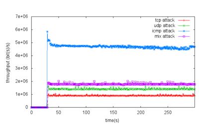 Figure 10. Throughput (bit/s), randomized attack traffic flooding
