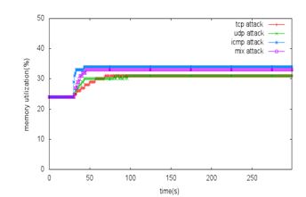 Various types of attack traffic in term of throughput, system CPU utilization and memory utilization are presented in Figure 7, Figure 8 and Figure 9, respectively. After the initial 30 seconds, the throughput jumps abruptly and achieves the maximum till the end of the attack period (Figure 7). This is because the zombie is programed to direct attack traffic to the victim at its maximum capacity. In Figure 8, we found that the system CPU usage is vulnerable to ICMP flooding. In ICMP flooding, the attacker overwhelms the victim with ICMP echo request packets, large ICMP packets, and other ICMP types to increase system CPU utilization, thereby slowing down the victim. We can conclude that ICMP flooding is CPU bound attack. The ideal way to deal with such attack is to ban zero-sized UDP packets via netfilter. On the other hand, the other three attacks have little effects on system CPU utilization. When flooded with DDoS attack messages, the victim uses up all its memory (Figure 9). The four types of attack traffic constantly and evenly saturate the victim’s memory. The victim host is then unable to perform operations that need additional memory.