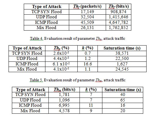 The minimum cost here is said to be k and s. Let k be the minimum percentage of system resource and s be the saturation time, respectively, exhausted by the attack traffic, such that the system service is disrupted. Table 3-5 represents the evaluation result of parameter Thf, Thp and Thm, respectively, for four types of attack traffic, which are measured by system operators 10 times. Table 6 indicates the statistics of attack traffic. We run 1,000 samples for each trial. From Table 3, we can find that the lowest value of Thf, 908,874 bits/s, is for TCP SYN Flood. Therefore, we choose 900,000 bits/s as the recommended value of Thf. Similarly, the lowest value of Thp, 2.6×10-3 %, is for TCP SYN Flood (Table 4) and the lowest value of Thm, 1,096 bits/s, is for UDP Flood (Table 5). We choose 3.0×10-3 % and 1,000 bits/s as the recommended value of Thp and Thm, individually.