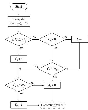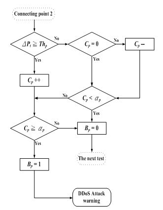 Let Thp and Cp be the incremental threshold and the incremental counter of CPU utilization, respectively. Whenever ΔPt exceeds Thp, Cp is incremented by 1. Otherwise, Cp, is decreased by 1 until it reaches 0. When Cp reaches its upper bound threshold,αp, the CPU utilization enters warning state. The Boolean variable Bp is set to be 1. Otherwise, Bp is initialized to be 0. Figure 3 is the flowchart of interface loading identification. Table 1 represents the status of combination of three parameters, Bf, Bm and Bp. We have three status results: OK, minor warning and attack alert. A flow is considered to be OK if passes through all the three parameters’ examination. A flow is plausible if only pass one or two parameters’ tests. We may consider it as minor warning and need one-way ANOVA test (will be described at section 3.3) to further verify. On the other hand, a flow is said to be attack alert if fails all the three parameters’ tests or two parameters’ test (at least including parameter Bp). The reason attack alert always includes parameter Bp is that an increase on CPU utilization of the victim is an indication of DDoS attacks [13].