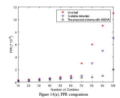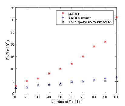 FNR increases as the number of zombies grows for Live Bait while remains constant for both of the proposed and Scalable detection. The reason is that Live Bait does not effectively deal with increasing number of attackers, which generate low-rate request as legitimate traffic [7]. As mentioned above, the proposed scheme can effectively detect DDoS attacks with additional consideration of ANOVA test.