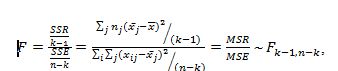 The numerator (MSR) is the variability between group means. The denominator (MSE) measures how much individual observations vary in each group from their group mean estimates. MSR is the mean squared treatment and MSE is the mean squared error. MSR and MSE stands for Regression Sum of Squares (SSR) and Error Sum of Squares (SSE) divided by its degrees of freedom k-1 and n–k, respectively. If the ratio of MSR to MSE is significantly high, we can conclude that the group means are significantly different from each other. The F-statistic is given below.