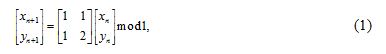 where ” mod 1″ represents the fractional part of a real number . The map is area preserving since the determinant of its linear transformation matrix is 1. The unit square is first stretched by the linear transform matrix and then folded back to the unit square by the modulo operation, which can be shown in Fig. 1. The 2D classical Arnold map can be generalized by introducing two real parameters to Eq. (1):