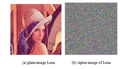(ii) Correlation analysis of adjacent pixels. It is of common sense that in a meaningful image each pixel is highly correlated with its adjacent pixels either in horizontal, vertical or diagonal direction. For an ideal encryption technique, the cipher image should get rid of the drawback of high correlation between pixels. In order to quantify and compare the correlation between plain-image and cipher-image, we calculate the correlation coefficients for all the pairs of horizontally, vertically and diagonally adjacent pixels of them respectively. The correlation coefficients of the selected pairs in horizontal, vertical and diagonal direction are calculated according to Eq. (7), where and are the selected pair pixels. is the total pixel pairs’ number of the sample. The correlation coefficients in horizontal, vertical or diagonal direction of the selected pairs for plain-image Lena and the cipher-image are given in Table 1. From the data in Table 1, we can see that even though there is high correlation in plain-image, the correlation in cipher-image is negligible. The proposed image encryption technique significantly reduces the correlation between the adjacent pixels of the plain-image.