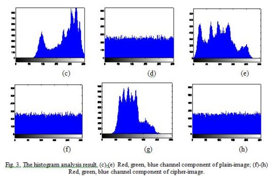 (i) Histogram analysis. A histogram shows the distribution of pixel values in an image by plotting the number of pixels at each grey level. An ideal histogram of an effectively ciphered image should be uniform and much different from that of the plain image. For an 8-bit gray image, there are 256 different possible intensities, the histogram shows the distribution of pixels among those 256 intensity values. For a 24-bit color image, we can draw the histogram for red, green, blue channels respectively. Encrypt the color image Lena one round with cipher keys . Then we plot the histograms for red, green, blue channels of Lena and the cipher-image in Fig. 3. It is obvious that the histograms of the cipher image are uniform and quite different from that of the plain image, which implies that the redundancy of the plain image is successfully hidden after the encryption, so it does not provide any useful information for statistical attacks.