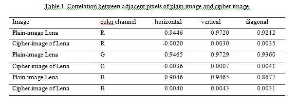 respectively. H and W are the height and width of image A or B. So we can get nine different correlation coefficients for a pair of plain-image and cipher-image and . For example, means the correlation between red channel of plain-image and red channel of cipher-image. The results of correction between Lena and its cipher image are shown in Table.3. We can see that the correlation between various channels of plain image and cipher image are very small, hence the cipher-image owns the characteristic of a random image.