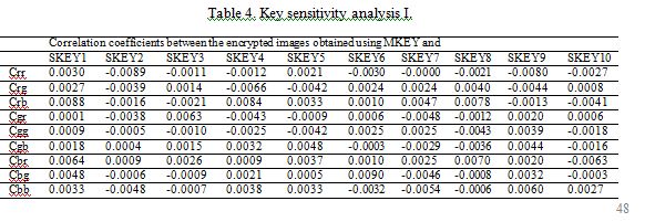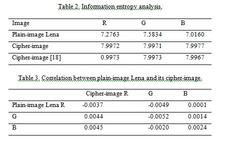 (iv) Correlation between plain-images and cipher-images. For an efficient encryption scheme, the cipher image should be much different from plain image and has low correction with plain image. We have already analyzed the correction between plain-image and cipher-image by computing the two-dimensional correlation coefficients between various color channels of plain-image and cipher-image. The two-dimensional correlation coefficients are calculated by