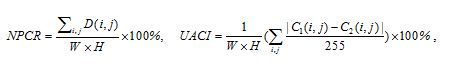 For an efficient encryption scheme, a slightly difference in the plain image should cause amount of difference in the cipher image. Two indicators, which are number of pixels change rate (NPCR) and unified average changing intensity (UACI), are used to measure the influence of one pixel change in the plain image on the cipher image. In order to calculate NPCR and UACI, suppose two plain images and with difference in only one pixel, and their cipher images are denoted as and . Then we create a matrix D, when , ; otherwise, . NPCR and UACI are calculated by