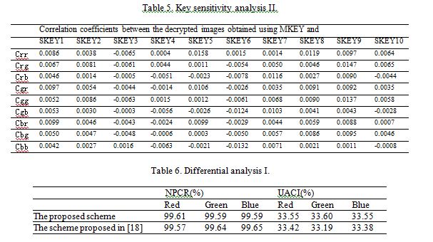 (i)To evaluate the key sensitivity in the first case, we encrypt plain-image Lena with MKEY and get the first cipher image, then we encrypt Lena with SKEY1-SKEY10 and get other ten cipher images. We have computed the correlation coefficients between the first cipher image and the other ten cipher images. The results are given in Table 4. From the table, we can see that all the correlation coefficients are very small which indicate that even there is only slightly difference between the cipher keys, the cipher images are greatly different. Hence the proposed encryption scheme is extremely sensitive to the cipher keys.