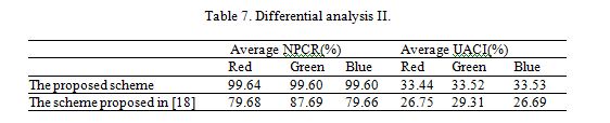 where W, H are the width and height of the images. We have performed the differential attack analysis in two cases: Encrypt the plain-image Lena using the proposed encryption scheme and get a cipher image. Add 1 to the last pixel value of Lena, then we get a new plain image. Encrypt the new plain-image, then the new cipher image is compared with the old cipher image to calculate NPCR and UACI. The results are given in Table 6. Randomly choosing 10 pixelsone at a time from Lena and add their values by one unit. The average NPCR and UACI are given in Table 7. From the two tables, we can see even though the algorithm in [18] have better performance on NPCR in Table 6, but on the whole, the proposed encryption scheme is more stable and has better performance on differential analysis.