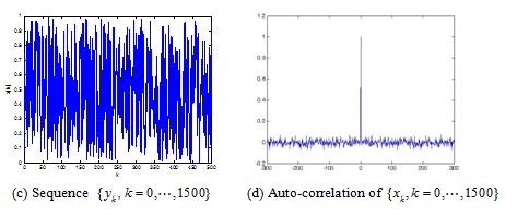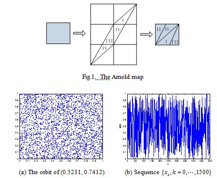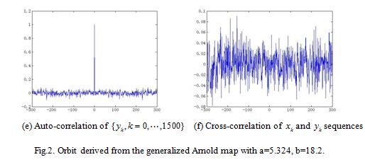 so the generalized Arnold map is always chaotic for , . The extension of from positive integer numbers to positive real numbers is an essential generalization of the control parameters, enlarging the key space significantly if it is used to design cryptosystem. Fig. 2 (a) shows an orbit of with length 1500 generated by the generalized Arnold map with , the x-coordinate and the y-coordinate sequences of the orbit are plotted in Fig. 2 (b) and Fig. 2(c) respectively. Some other good dynamical features in the generalized Arnold map, such as desirable auto-correlation and cross-correlation features are demonstrated in Figs. 2(d)-(f). The good chaotic nature makes it can provide excellent random sequence, which is suitable for designing cryptosystem.