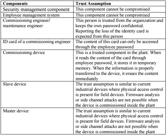 Devices which are involved in data communication are commissioned by commissioning or maintenance personnel. The employees are the authorized persons to handle a device, therefore when the commissioning person places the device in the network; the trust parameter of the employee which is stored in the ID card is transferred to the device. When the device presents the configuration credentials, it also presents the encrypted employee trust. Commissioning engineers have sufficient experience to demonstrate that they know the safety regulations and machine directives to formally “sign-off” a commissioned plant. Hence, a commissioning engineer is trusted for the operational safety of a plant. Verifying that employee trust, the device can be authenticated that it is commissioned by an authorized person. This trust of the employee is transferred to the device only when the authorized commissioning or maintenance personnel swipes the employee identification card in card reader. Therefore, any other device which is not commissioned by authorized persons in the plant can easily be detected in this framework as only the employee can store this encrypted trust. In the future if the device has the capability to read the identity card, then the trust can be transferred directly without the need of an additional commissioning device.