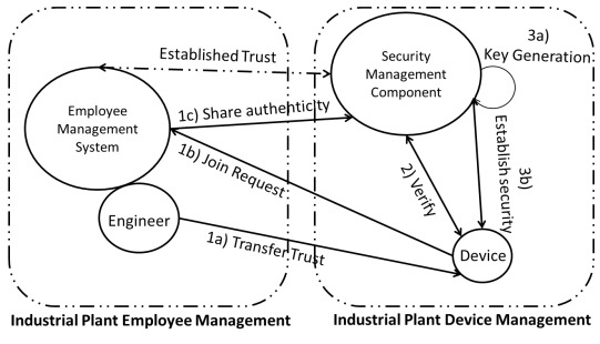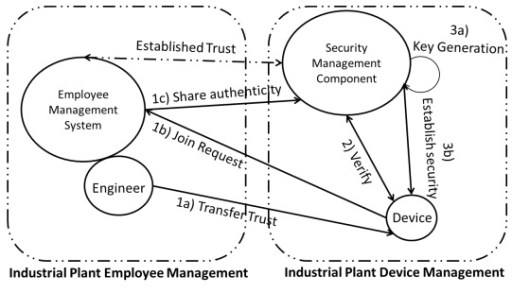 In our proposed framework, the employee needs to swipe the ID card to the handheld terminal and provide authenticity. The employee is not required to enter any specific secret key for the device, instead the ID card is used in the same way it is used to access factory entry. The devices can present this trust information to receive the keys from the security management component. Therefore, in this framework, the initial security parameters do not get revealed to the employee who is configuring, instead the encrypted parameters are used to verify the authenticity of the device and the engineer. Once the device is authenticated by the employee management system, the configuration data and the related information is transferred to the security management component. Then the security management component becomes responsible for the key management of the whole network.