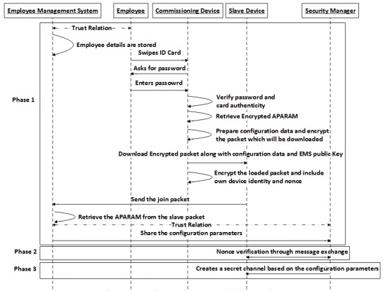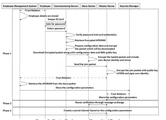 In direct topology, the slave device has direct connectivity with the employee management system and once the device is verified, the security management component generates the key KSM-S which will be used for first time communication between the security management component and the slave device S and is later replaced by the security manager component which enforces standard key establishment for the network as state-of-the-practice. Then it encrypts the KSM-S with RNDS and sends it to the slave device.