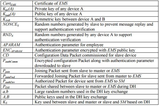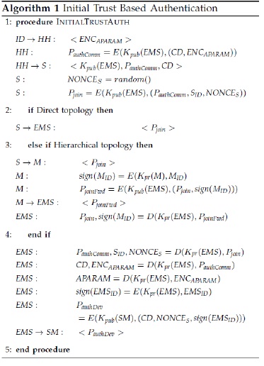In the initial trust based authentication as shown in Algorithm 1, the slave device S generates one random nonce NONCES. It also appends its own device identity SID and then it encrypts the downloaded PauthComm, SID, and NONCES with the Kpub(EMS). This encrypted packet is denoted as Pjoin. The Pjoin is sent to the higher level devices for further security management.