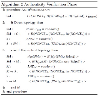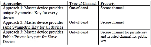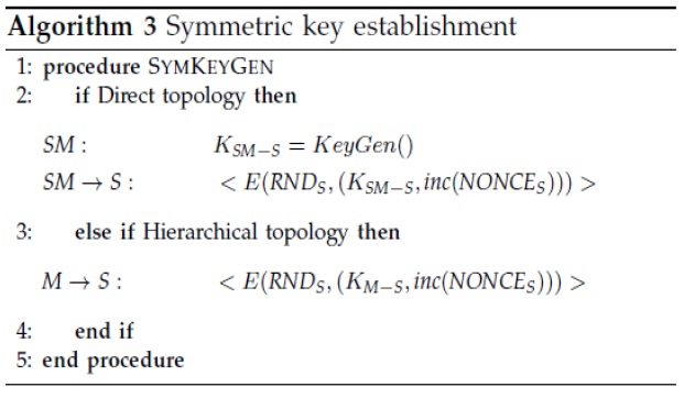 As shown in Algorithm 3, during authentication in direct topology, both the security management component and the slave device will use the same key if symmetric key based security management is used. In hierarchical topology, both the master device and the slave device will use a common key.