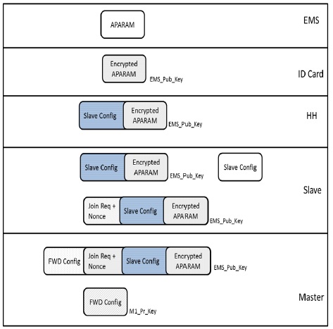 The overall packet transfer in this proof-of-concept implementation is presented in Figure 4 to make it easier for readers to visualize the framework implementation. The EMS component keeps the APARAM as secret. It encrypts the APARAM with the EMS public key and downloads it to the ID card. The HH component, takes this encrypted APARAM value once the employee verification is done and adds the configuration of the slave device. Then it encrypts the whole packet with the EMS public key. The HH also downloads the slave configuration file inside the device. The slave device takes the encrypted packet and adds a generated nonce and its identity. Then it encrypts the whole packet with the EMS public key and sends it to the next level of device. After receiving the packet, the master device adds its configuration data and encrypts the whole packet with the EMS public key. It also signs its identity and forwards the packet to the next forwarding device or the EMS. Using the private key of the EMS, the EMS can retrieve the forwarding device details, joining device details, the configuration of joining device and the APARAM.