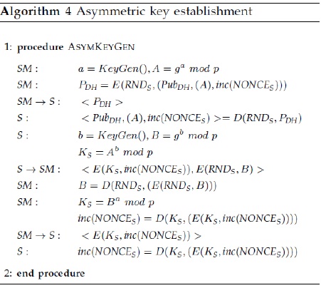 As shown in Algorithm 4, the security management component generates secret key a and computes A = ga mod p. The modulus p and base exponent g are the parameters denoted as PUBDH. Then the security management component increments the nonce by 1 and creates the packet with A, PUBDH and nonce. It then forwards the packet to the slave device encrypting with RNDS. The encrypted packet is denoted as PDH. The slave device decrypts the packet PDH with RNDS and retrieves PUBDH and verifies that the nonce is incremented by 1. It generates a secret key b, and computes B = gb mod p. Then it generates the secret key KS by Ab mod p. It encrypts the incremented nonce by KS and encrypts B by RNDS. It forwards the packet to security management component. The security management component retrieves B by decrypting with RNDS and generates secret key KS by Ba mod p. It also retrieves the new incremented nonce by decrypting with KS. It again increments the new nonce by 1 and encrypts with KS. It then forwards the packet to the slave device. The slave device verifies that the nonce is again incremented by 1.