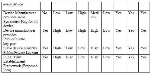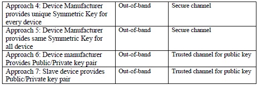 In all these seven approaches we mentioned, the public/private key or symmetric key is required to be installed in the device using an out-of-band mechanism. This requires a trusted, or trusted and secured channel. Table 4 presents a high level comparison between proposed method and other approaches for the following objectives.